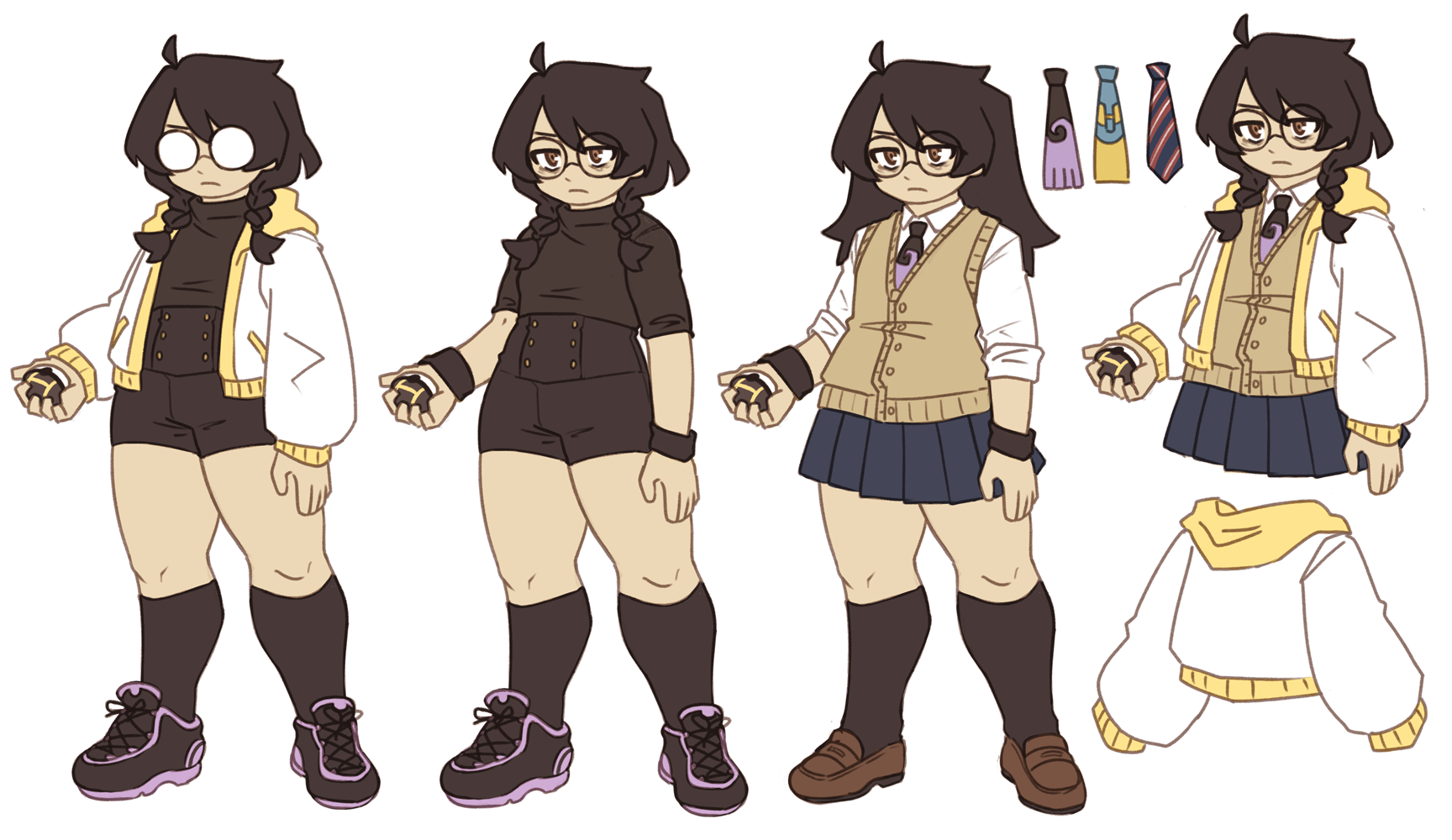 Typically depicted wearing a short-sleeved turtleneck paired with a white and yellow cropped hooded jacket. Wears this alongside high-waisted shorts, kneesocks and sneakers. Often wears two black wristbands as well.